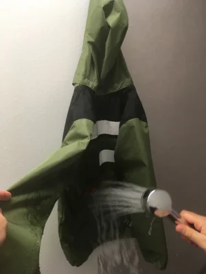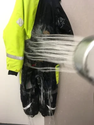 Um die Grenzen wirklich auszutesten, haben wir einen „Wassertest“ an einem klassischen Overall mit verschiedenen Material- und Gewebearten durchgeführt.