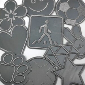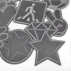 Reflektoren zum Aufbügeln auf alles, vom Rucksack bis zum Overall. Perfekt, um einen Riss zu verstecken, oder einfach, um in der Dunkelheit gesehen zu werden. Eine Bestellung enthält 12 Stück in unterschiedlichen Größen und Motiven.