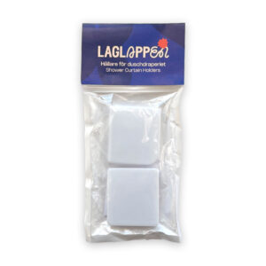 Selbstklebende Klammern aus weißem Kunststoff, die den Duschvorhang an der Wand halten. Eine Bestellung enthält 2 Klammern.