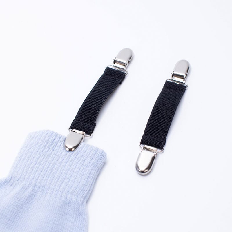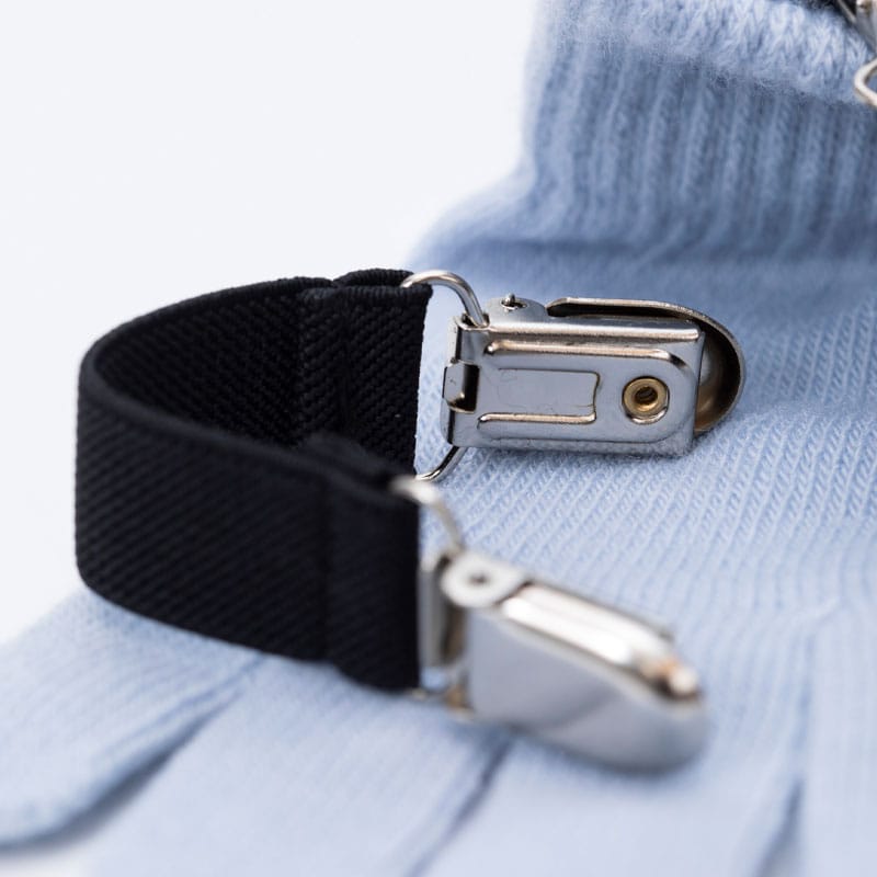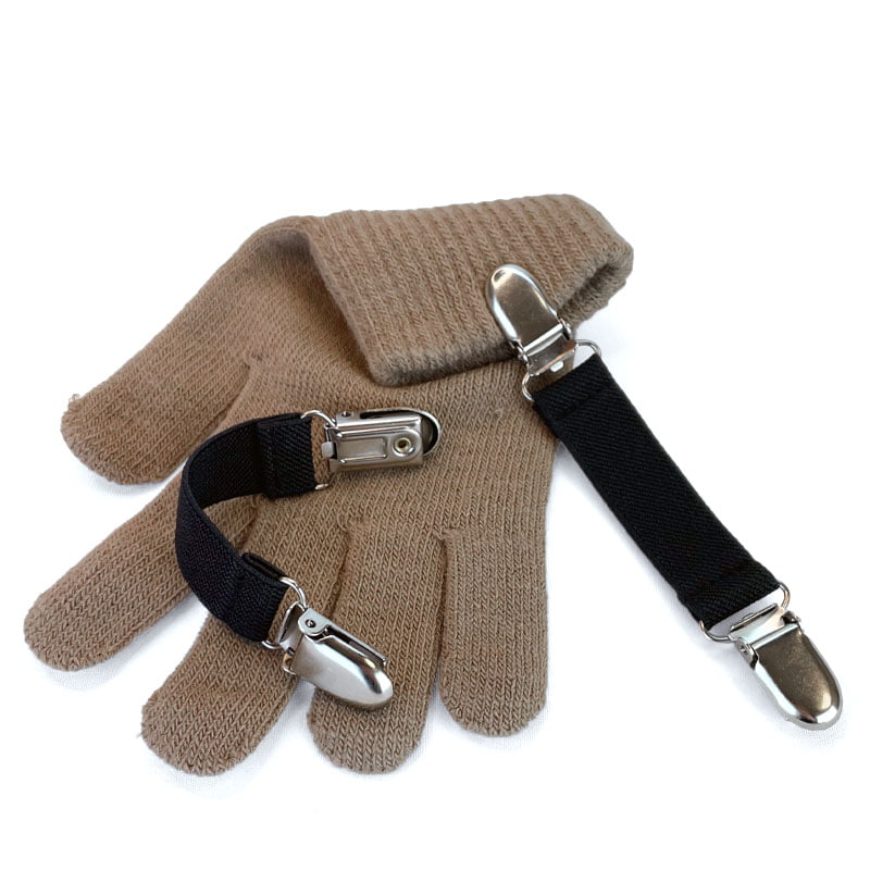 Mit einem elastischen Band und haltbaren Metallclips werden die Handschuhe sicher befestigt.