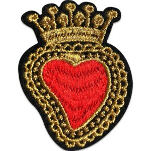 Das herz mit Goldkranz ist ein Bügelbild in der Größe 4,5 x 6 cm cm. Es kann ganz einfach auf Kleidung oder andere Stoffe aufgebügelt werden. Benutze Das Herz zum Flicken, Reparieren oder zum Verschönern von alten Kleidern.