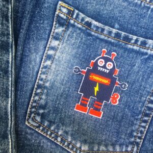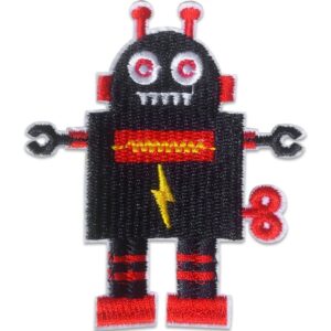 Suchst du ein lustiges Bügelbild für Kinder? Da bist du mit diesem Bild vielleicht genau richtig. Der Roboter mit Blitz ist gestickt und zum Aufbügeln auf Kinderkleidung gefertigt. Einfach der beiliegenden Bügelanleitung folgen und die Hosen strahlen in neuem Glanz!