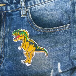 Bügelbild mit T-Rex-Motiv. Tolles und buntes Design. Das Bild ist 10,8 cm groß und in leuchtenden Farben gestickt. Der T-Rex kann zum Flicken einfach auf Kleider aufgebügelt werden. Kann außerdem beim Verschönern und Erneuern von Stoffen zum Einsatz kommen.