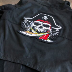 Cooler Aufnäher mit Pirat, Dreispitz und Säbeln. Die Größe beträgt 24 x 22 cm. Zum Aufnähen.
